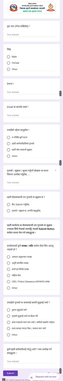 उनका अनुसार प्रहरीले गरेका काम कारबाही बारे कुनै गुनासो वा सुझाव भए निर्धक्क रुपमा क्युआर कोड स्क्यान गरेर पठाउन सकिन्छ र यसो गर्दा गुनासो टिपाउने व्यक्तिको परिचय गोप्य रहनेछ ।
