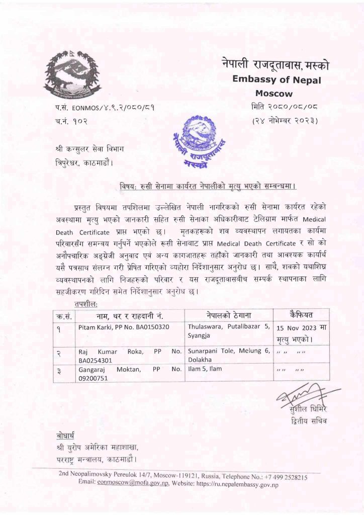 उनीहरुको मृत्युको खबर रुसी सेनाको अधिकारीबाट टेलिग्राम मार्फत प्राप्त भएको मस्कोस्थित नेपाली राजदुताबासले जनाएको छ ।