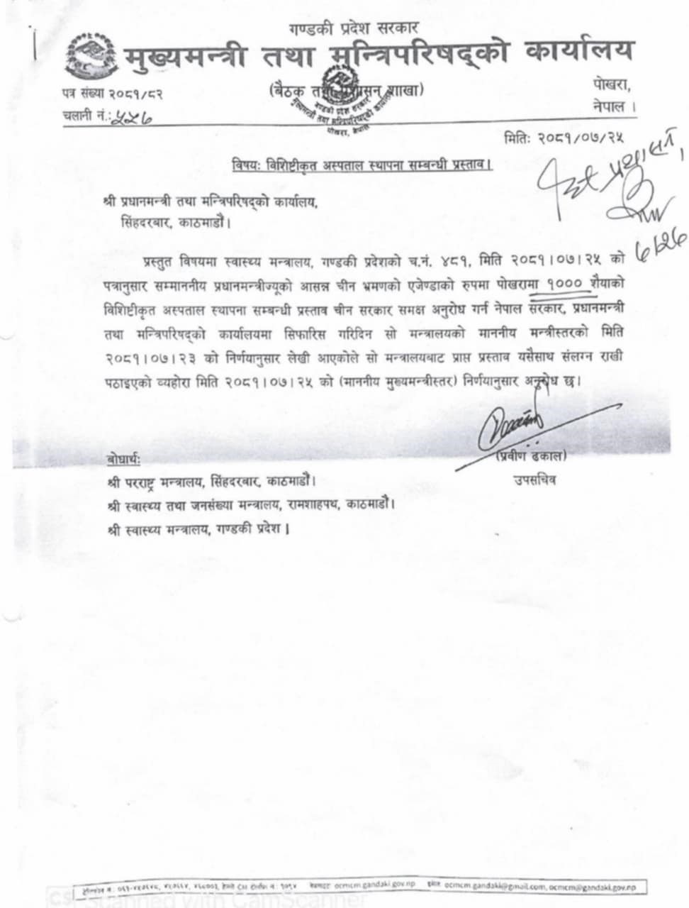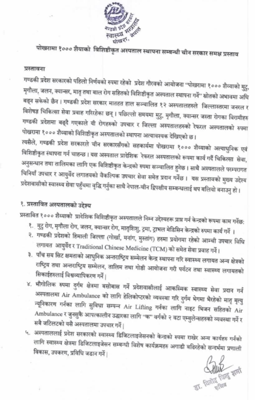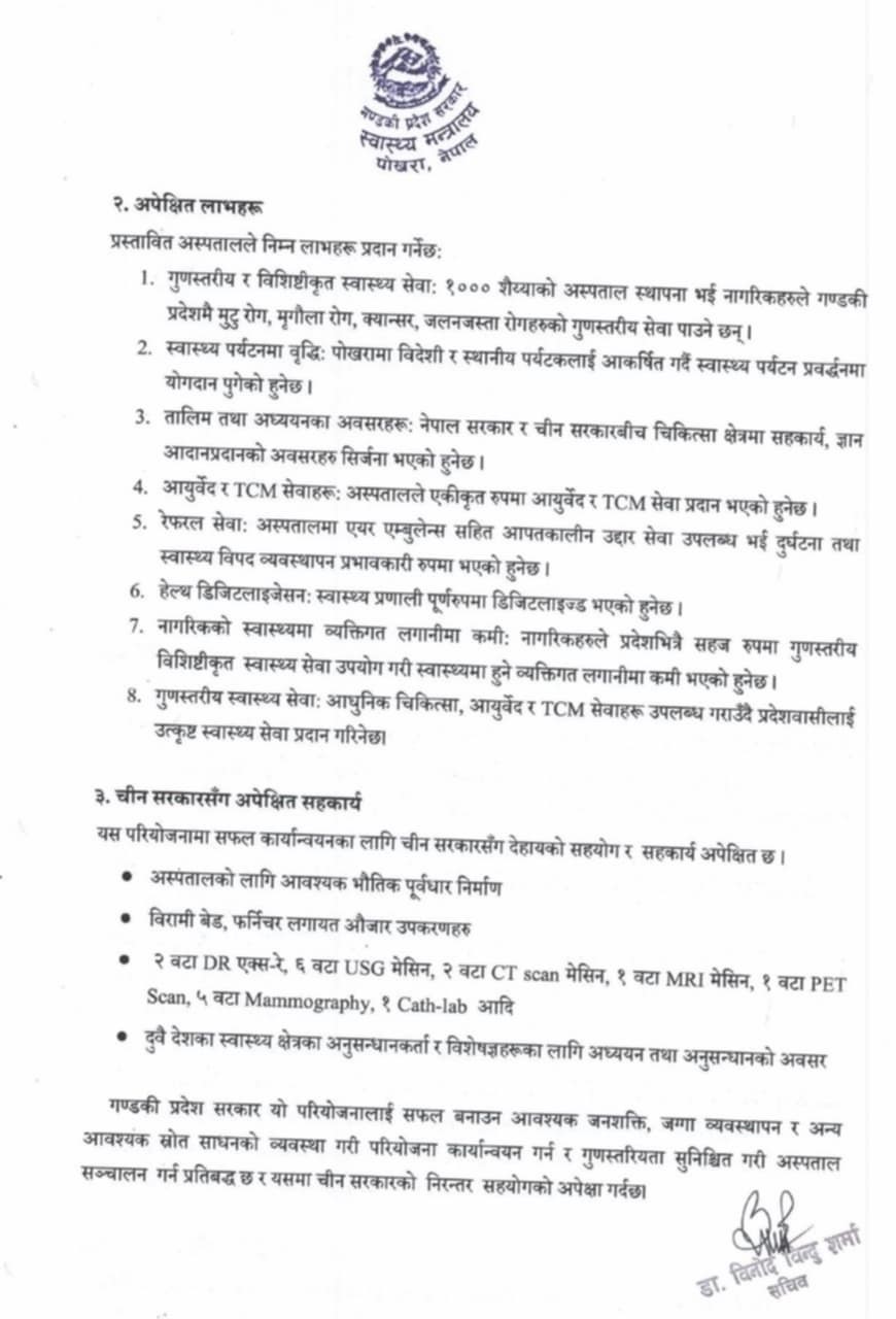 “प्रदेश स्थापना भएपछि पहिलो प्रदेश सरकारले प्रदेश गौरवको आयोजनाका रुपमा विशिष्टीकृत अस्पताल बनाउने निर्णय गरे पनि स्रोतको अभावमा उक्त काम अझैसम्म अगाडि बढ्न सकेको छैन”, उनले भने, “प्रधानमन्त्रीको चीन भ्रमणको एजेण्डाका रुपमा यो अस्पताल समावेश भएर परियोजना कार्यान्वयन हुनसक्यो भने गण्डकी प्रदेशवासीले महत्वपूर्ण लाभ लिन सक्छन् ।”