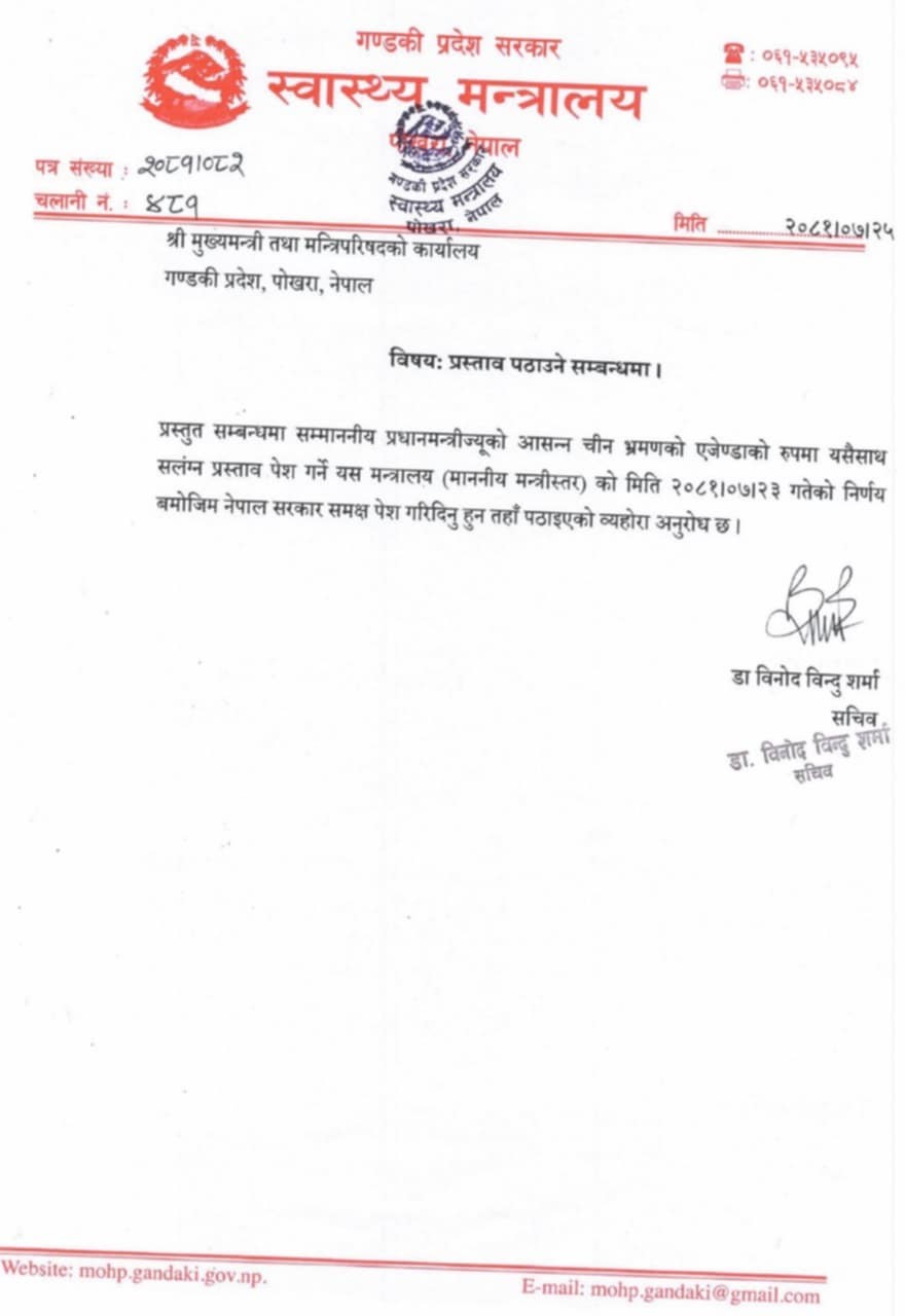 प्रदेश सरकारका स्वास्थ्यमन्त्री कृष्णप्रसाद पाठकले मन्त्रीस्तरीय निर्णय र प्रदेश मन्त्रिपरिषद्को सिफारिससहितको उक्त प्रस्ताव आइतबार सङ्घ सरकारका मुख्यसचिव एकनारायण अर्यालसमक्ष पेस गरेका हुन् ।